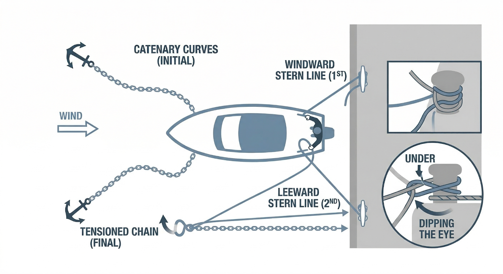 Everything's rigged and ready on deck, so here's exactly how the med-mooring sequence works.