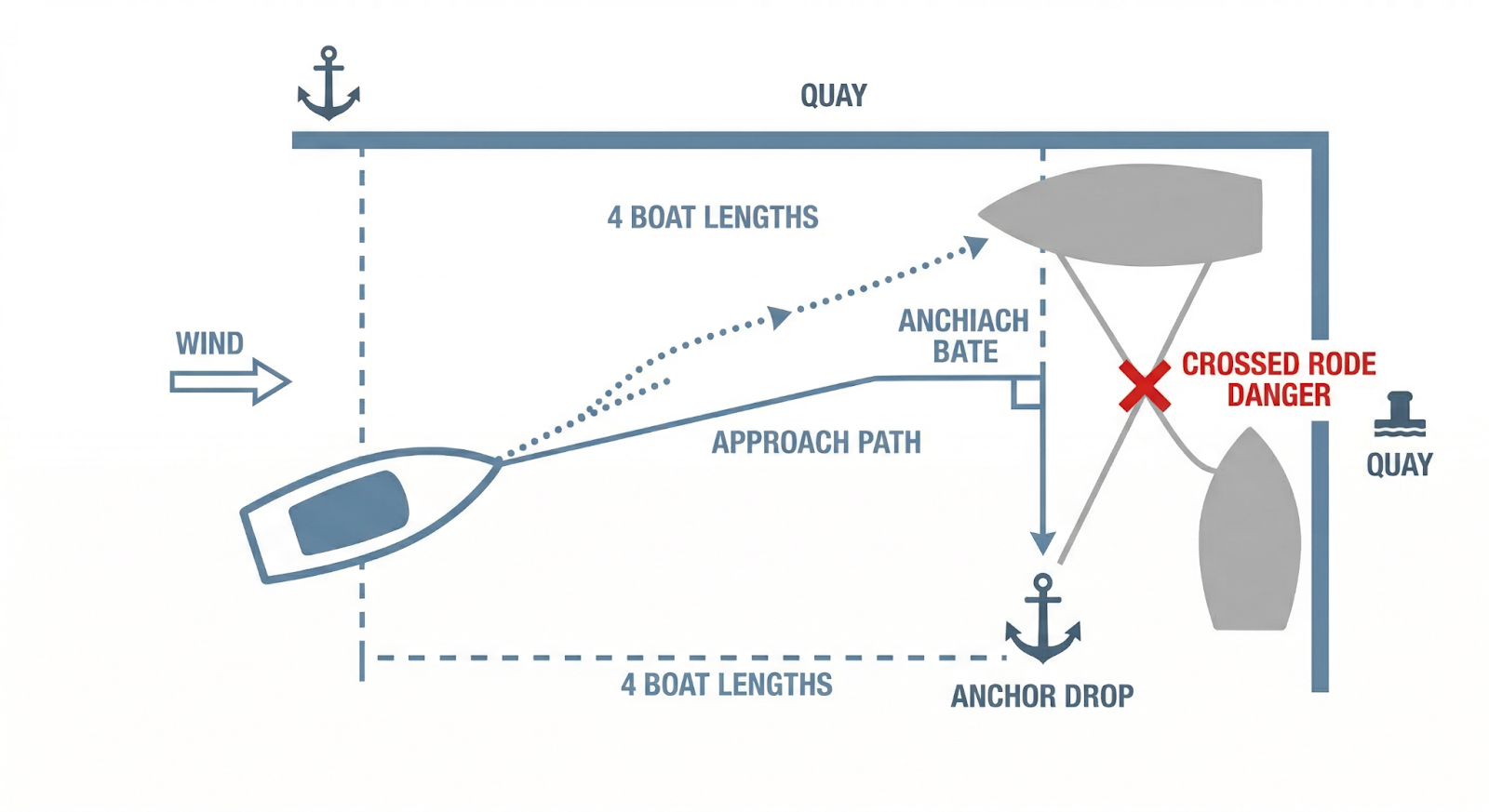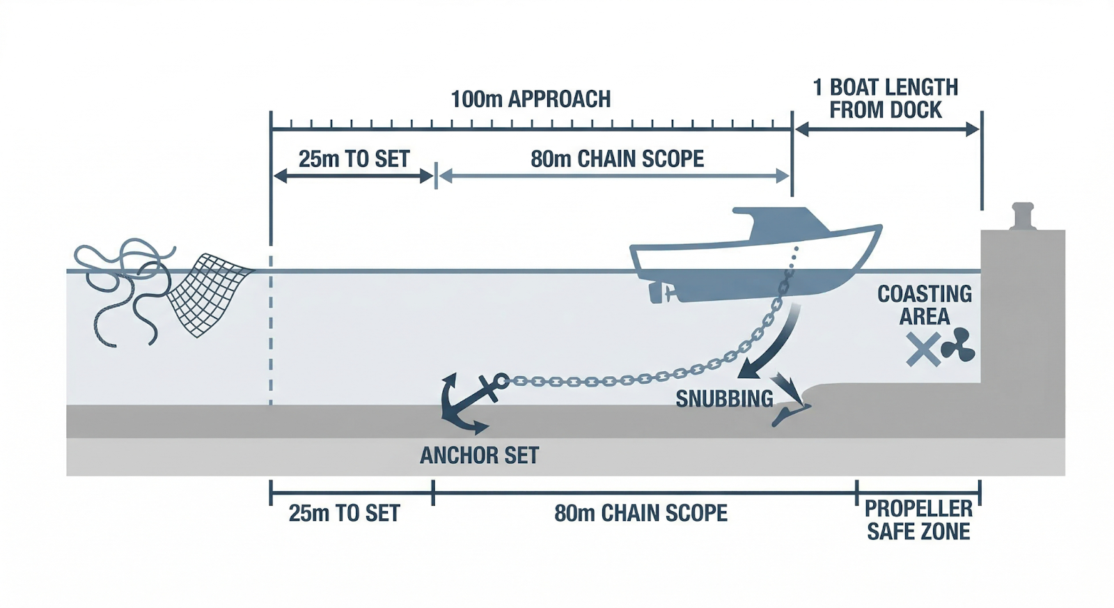 Pro tip: With 80 meters of chain, starting about 100 meters from the quay gives the anchor roughly 25 meters to set and maximizes scope.