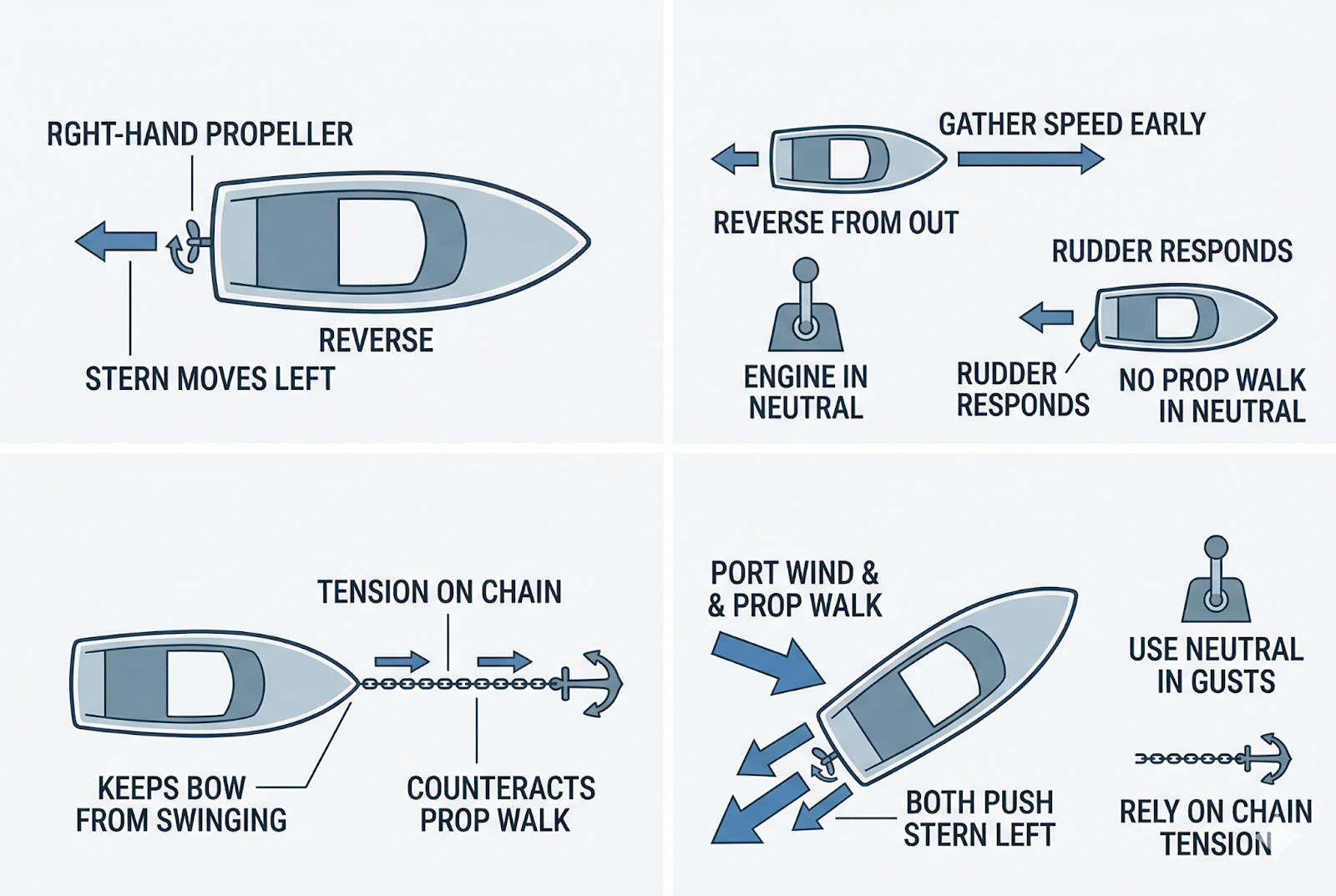 - Gather speed early. Reverse from further out, then put the engine in neutral. Without prop walk, the boat responds to the rudder normally.