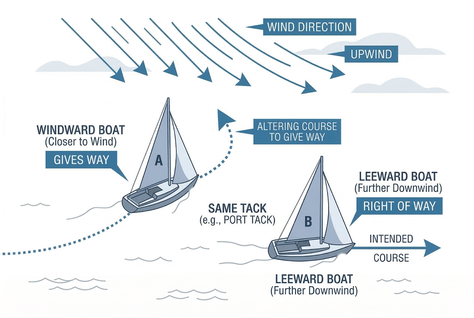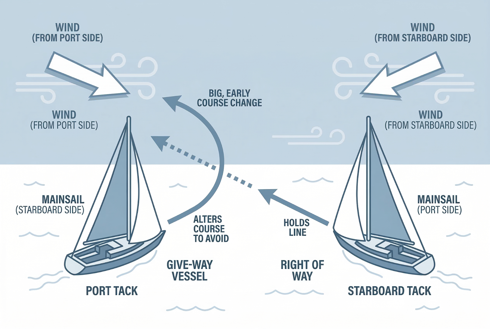 Picture two boats sailing toward each other from opposite directions. The starboard tack boat holds its line while the port tack boat alters course to avoid a collision.